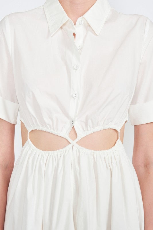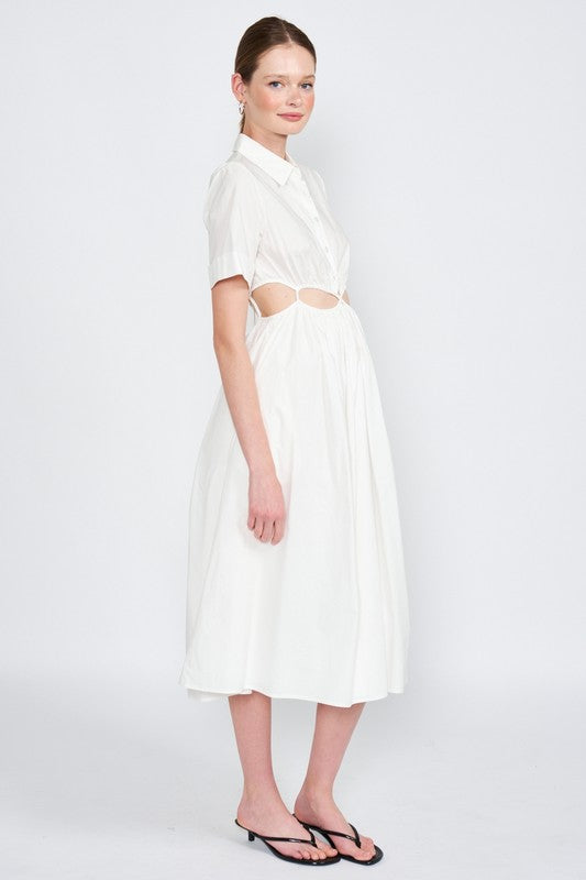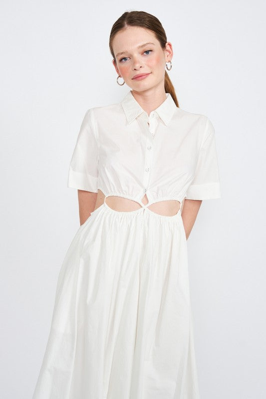 BUTTON UP COLLARED MIDI DRESS WITH CUT OUT
