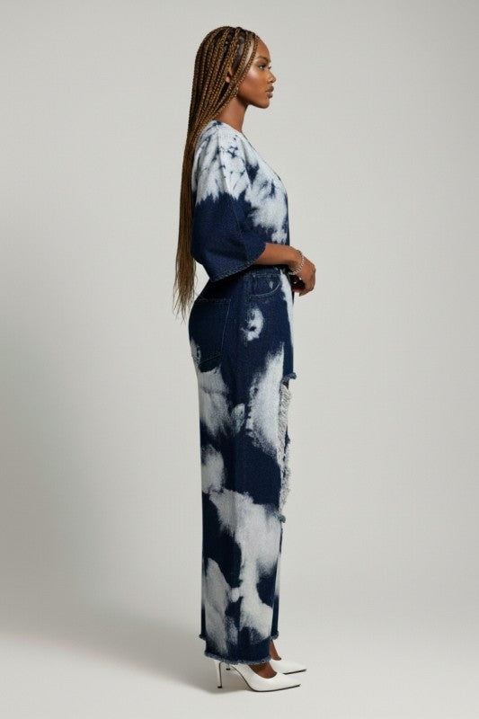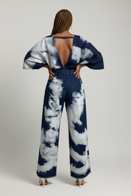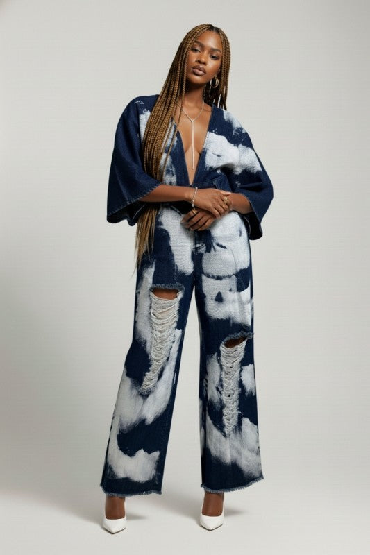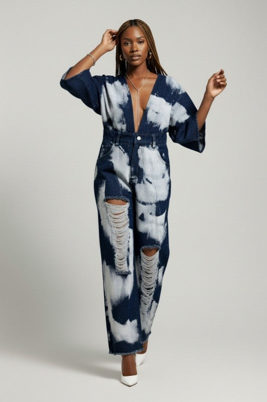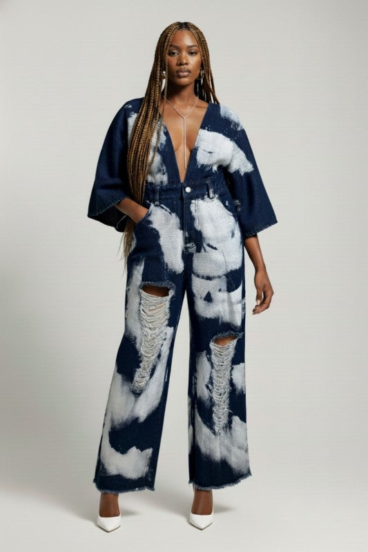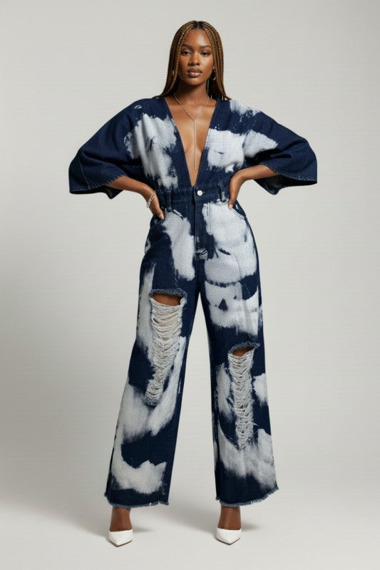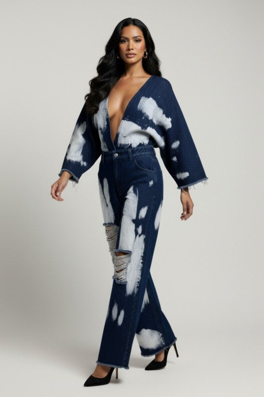 Turn heads with this bold statement jumpsuit featuring an allover bleach-wash pattern for a striking, high-fashion denim look. Designed with a dramatic deep V neckline and relaxed kimono-style sleeves, this piece blends streetwear edge with elevated boutique styling.